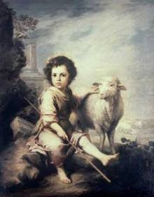 Bartolomé Esteban Murillo (1618-1682). Pintor barroco espanhol. Foi influenciado por Ticiano, Van Dyck e Rubens. Nascido e radicado em Sevilha foi fundador da Academia de Desenho de Sevilha. Seu prestígio na Espanha era enorme, ele foi convidado pelo rei Carlos II a instalar se em Madrid. Era considerado o pintor do povo, pois seu trabalho retratava os contemporâneos simples ou ilustres. Morreu ao cair de um andaime. The Good Shepherd (1660), Museu do Prado. Murillocostumava a representar os santos como crianças. Aqui ele seguiu as palavras do próprio Jesus: “The good shepherd who gives hislife for his sheep”.