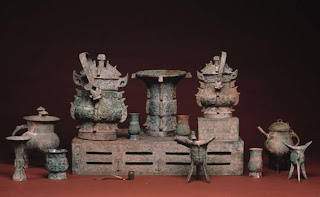 Autor desconhecido Tuan Fang Altar Set. China. O serviço para vinho consiste de uma mesa e treze vasos para armazenar, misturar, aquecer e beber o vinho. Serviços como esses eram feitos por encomenda para ocasiões especiais. Os desenhos e as sofisticadas formas dos vasos indicam como os chineses dominavam com maestria a fundição do bronze.